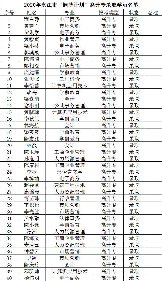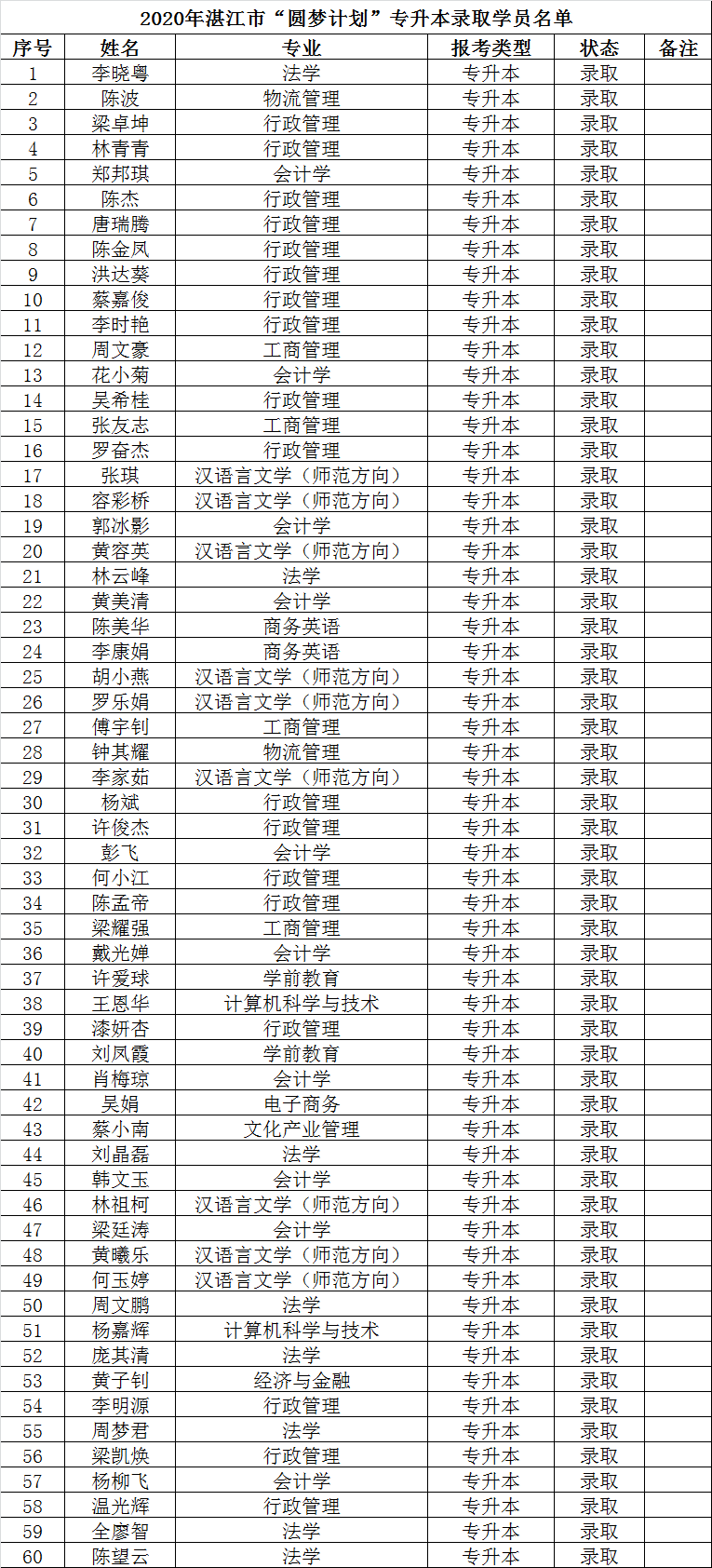 近日,共青团湛江市委公示2020年"圆梦计划"拟录取名单(名单见附件),100名湛江新生代产业工人将圆大学梦。