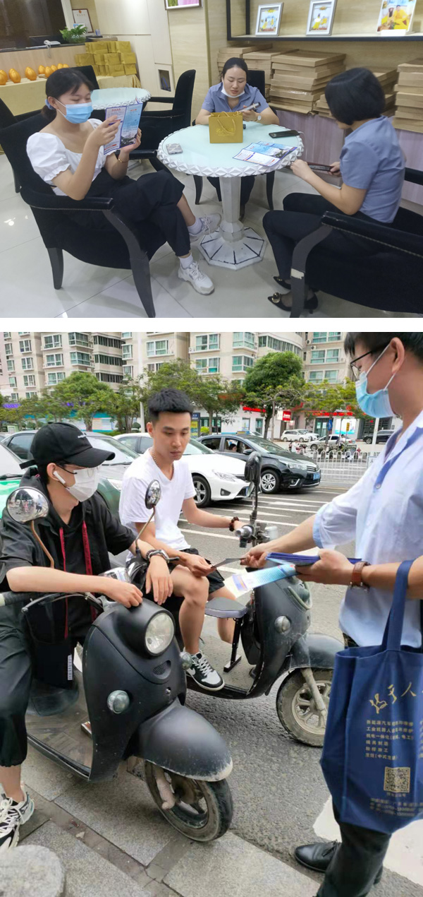 我校学生志愿者白天上班,下班后晚上6点半准时到学校集中,到招生科领取招生资料,经过6天奋战,在各街道沿街沿店发放招生简章、环保袋、折扇等招生宣传资料给路人、店主,电动车、小汽车等交通工具6000多份。计划再用三天时间3000多份资料对鼎盛广场、万达广场、金沙湾广场及凯德广场进行招生宣传覆盖。