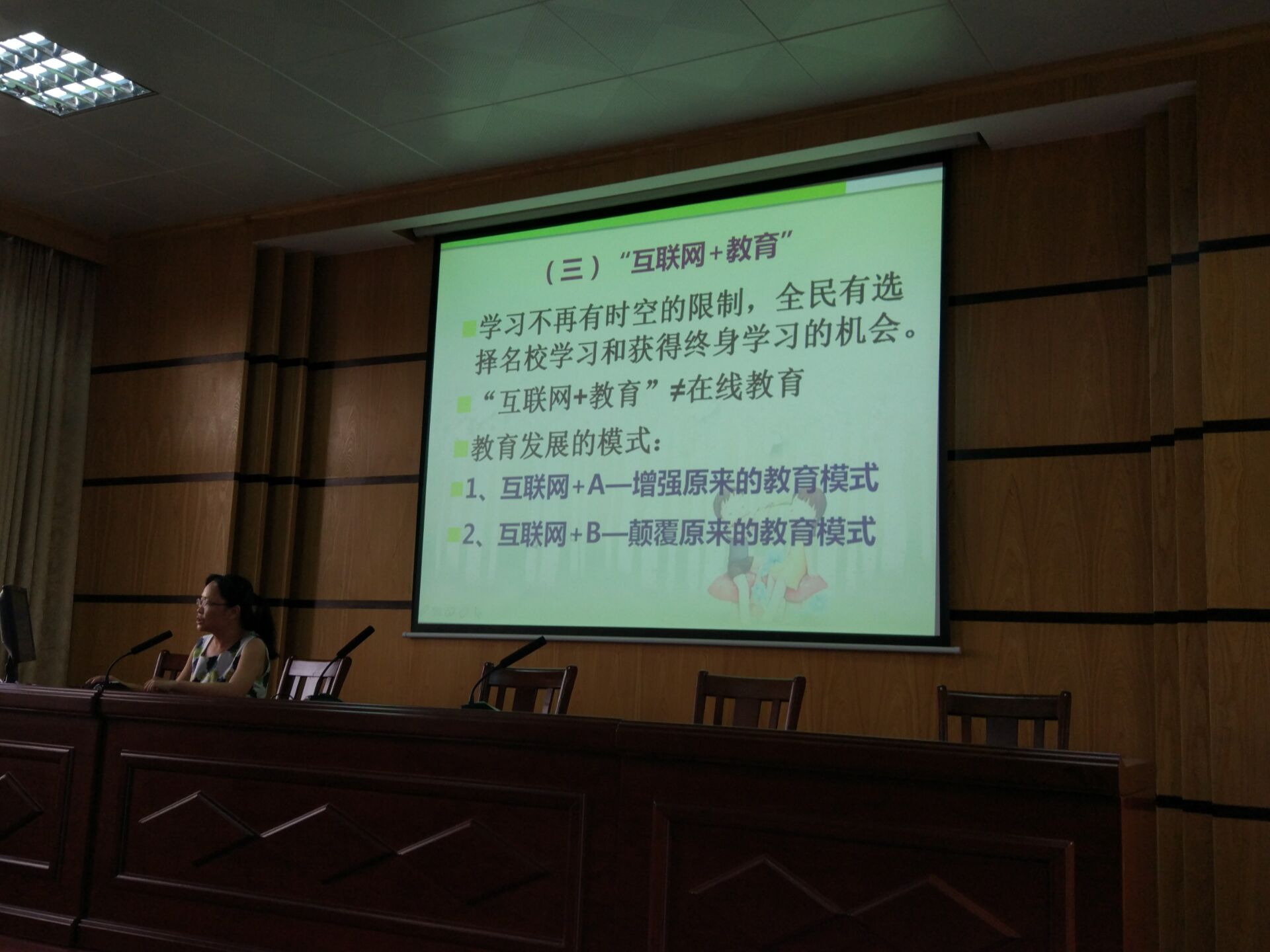 首先,办公室苏秀敏副主任向大家详细说明了今年专业技术人员继续教育学习的内容情况及具体要求。其次,文法教研室关一谱副主任向大家作了题为"互联网+教育"的讲座。关老师结合电大的教学特点,向大家讲述了"互联网+教育"的具体内容,指出"互联网+教育"≠在线教育,并详细讲授了教育发展的两种模式:1.互联网+A--增强原来的教育模式2.互联网+B--颠覆原来的教育模式。