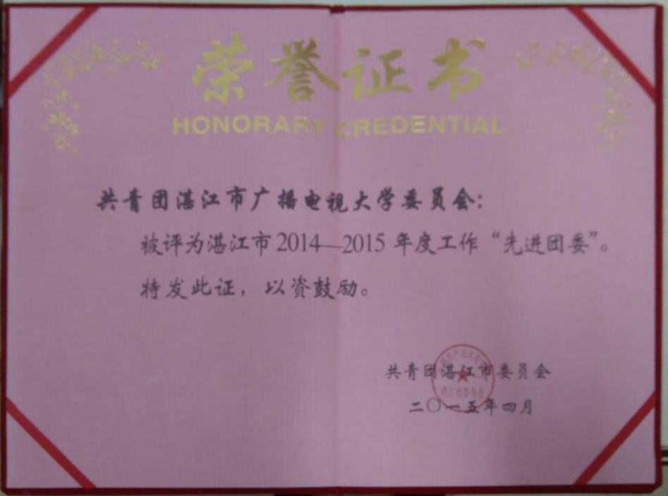 共青团湛江市第十二届十一次全委(扩大)会议上传来喜讯,我校团委被评为湛江市2014-2015年度工作"先进团委"。