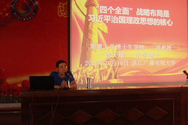 10月19日下午,学校邀请湘潭大学博士生导师曾天雄教授来校为全体教职工作了题为《"四个全面"战略布局是习近平治国理政思想的核心》的专题讲座。讲座贴近政策前沿、理论前沿和实践前沿,是曾教授主持的国家社科基金项目重要部分。