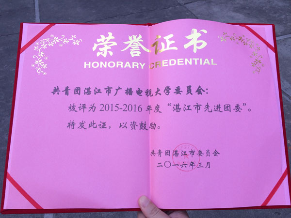 共青团湛江市第十三届二次全委(扩大)会议上传来喜讯,我校团委被评为湛江市2015-2016年度工作"先进团委"。