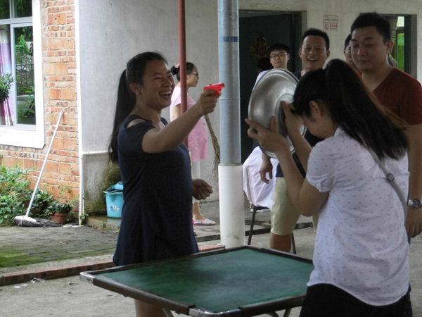 第一个游戏是"水枪攻防战",游戏规则很简单,但玩起来却非常考验同学们的团队合作能力。两队选手互相用水枪攻击对方,允许遮挡,看谁"中枪"多。工作人员一声哨响,比赛进入白热化阶段!经过两轮激烈的较量,第一组胜出!