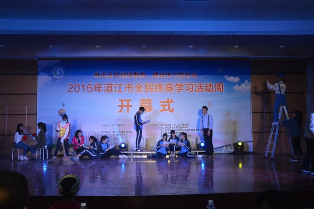 开幕式由湛江市教育局主办,湛江市广播电视大学、湛江社区大学承办,湛江市各县(市、区)教育局、湛江经济技术开发区教育局、南三岛滨海旅游示范区社会事务局教育主管部门、湛江市各中等职业技术学校、湛江市金融消费权益保护联合会协办。本次活动周以"推进全民继续教育,建设学习型社会"为主题,旨在通过开展多样化的学习活动,大力宣传终身教育的思想,推动全民树立终生学习理念,建设学习型社会。活动时间为2016年12月12日至16日。在接下来一周或更长一段时间里,我市将围绕"推进全民继续教育,建设学习型社会"的主题,开设一系列免费的公益课程和讲座,为老百姓提供丰盛的知识盛宴。