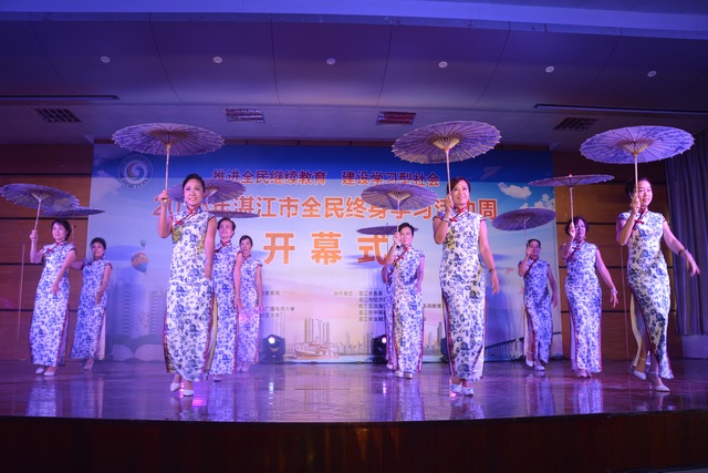 开幕式活动分三个环节进行,首先是参加活动的人员签到并参观了承办方的学校全民终身学习的最新成果,美术、书法、摄影等作品展示,然后集中湛江市广播电视大学主校区礼堂观看自编自演的文艺节目,其中,中华旗袍、岭南功夫茶等文艺表演节目引得大家啧啧称赞,彰显出传统文化魅力,最后宣布活动周开幕。