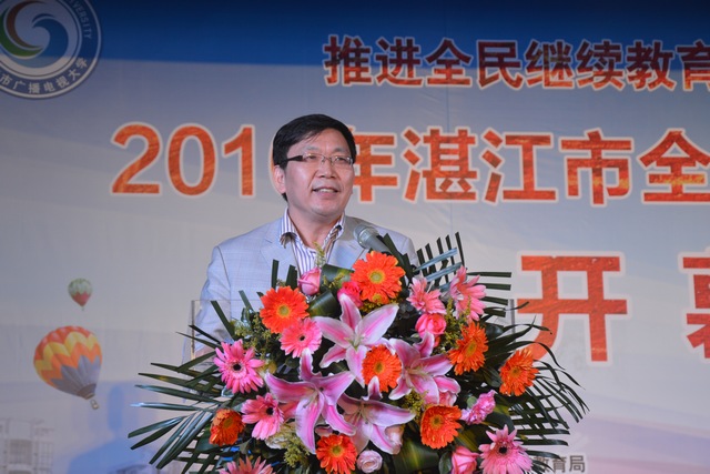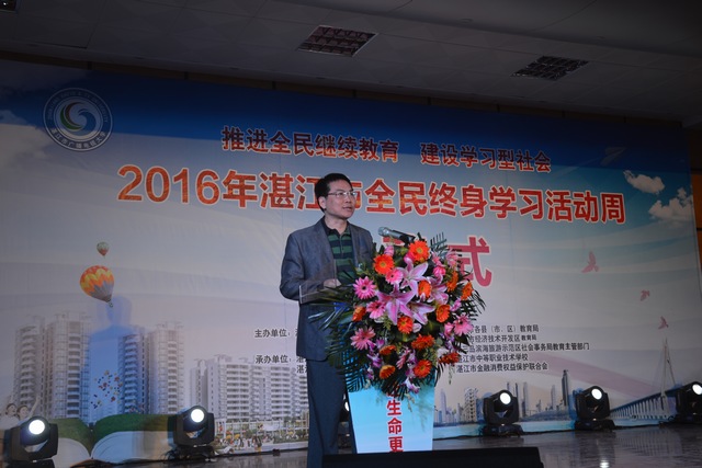 本次活动由湛江市教育局副局长冯燕锋主持,湛江市广播电视大学党委书记、校长李连红致辞,学习代表王筱玲发言,湛江市政府副秘书长杨文光宣布湛江市2016年全民终身学习活动开幕。