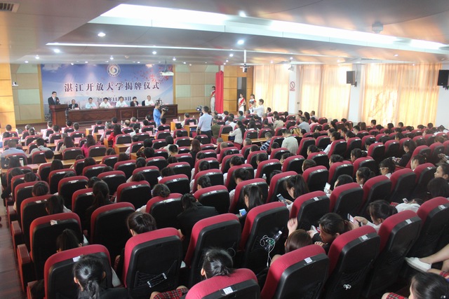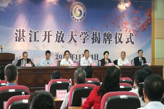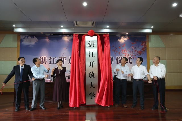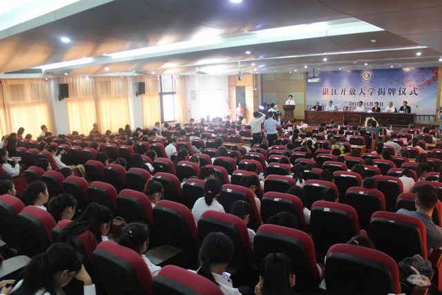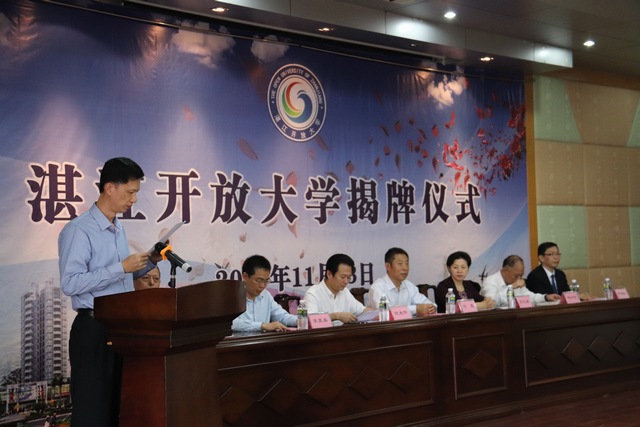 11月13日上午,湛江开放大学揭牌仪式在校本部11楼多功能报告厅举行,正式揭开学校发展新篇章。国家开放大学副校长刘臣、广东开放大学校长刘文清、湛江市副市长欧先伟、湛江市副秘书长林小伟、市教育局局长李更盛、湛江开放大学校党委书记、校长李连红共同为湛江开放大学揭牌。市委组织部、市委宣传部、市编办、市发改局、市教育局、市财政局、市人社局、市总工会、团市委及市直学校、各县(市、区)教育局、各县(市)电大的领导出席了揭牌仪式。仪式由湛江开放大学副书记饶腊年主持,市编办副主任李雄宣读《关于湛江市广播电视大学更名的批复》,李连红校长致欢迎辞。