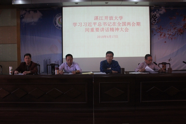 4月17日,湛江开放大学在校本部11楼召开学习习近平总书记在全国两会期间重要讲话精神大会。大会由校党委副书记饶腊年主持,校党委书记、校长李连红,副校长尤祖国、副校长李聪睿出席大会,全体教职工参加大会。