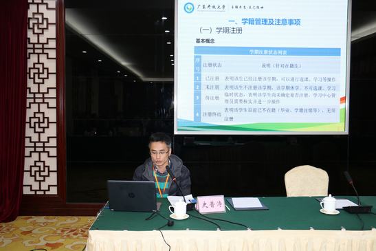 此外,广开考务科李刚及综合科周杰分别就"考务工作流程及注意事项"、"广开教学教务平台微信公众号"发表了讲话。