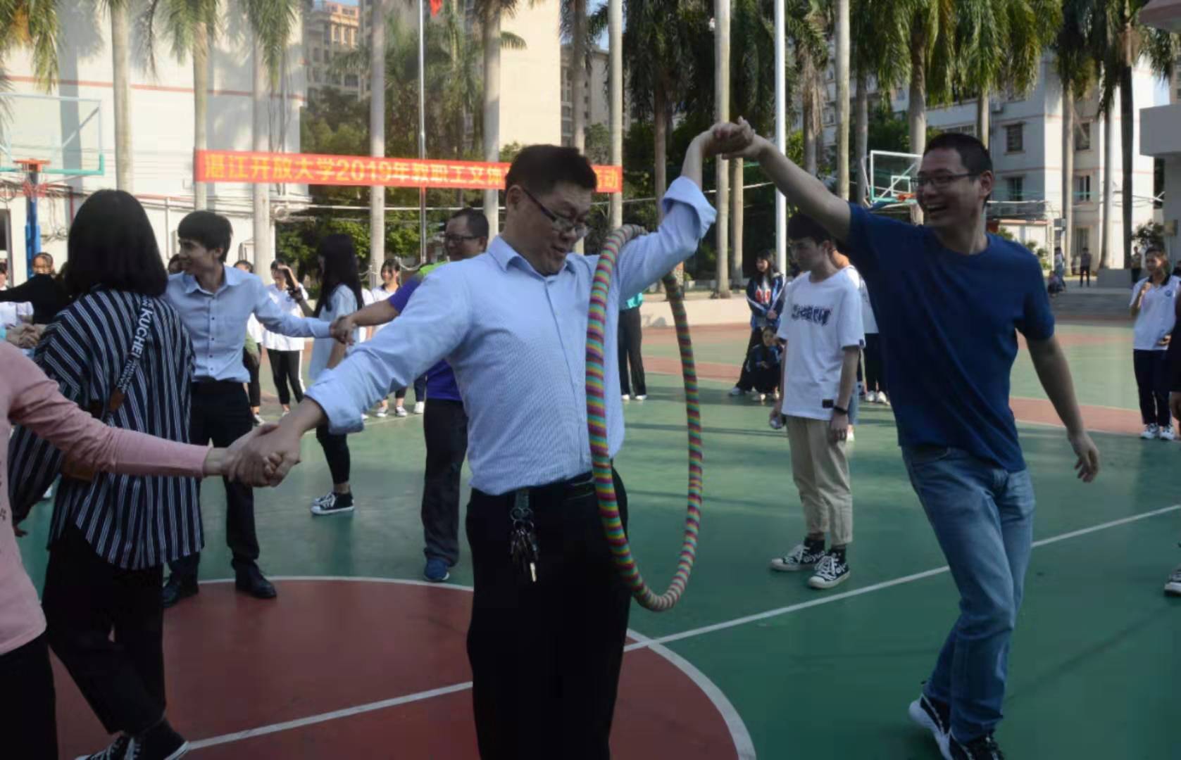为了使学校教职员工拥有一个健康的身体和一份美丽的心情,以锻炼身体、缓解压力、增进同事间的凝聚力为前提,丰富精神世界,提升生活品质,真正达到"每天锻炼一小时,健康工作五十年,幸福生活一辈子"的目的。11月8日下午,湛江开放大学工会组织教职工在主校区操场开展文体及健身游园活动,学校党委书记、校长许文滔、纪委书记、工会主席江宇静及全体教职工近百人参加了活动。