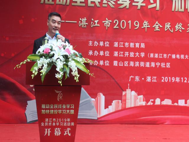 湛江开放大学党委书记、校长许文滔在开幕式致辞中表示,举办全民终身学习活动周,是为了深入学习贯彻党的十九届四中全会关于"构建服务全民终身学习的教育体系"会议精神,进一步构建全民终身学习体系,努力满足人民群众多样化、高质量教育的现实需求,在全市上下形成全民学习,终身学习,积极向上的社会风气。学校尽全力做好了全民终身学习活动周开幕式的各项准备工作,同时也将持续保障活动周其他相关事项的顺利推进。