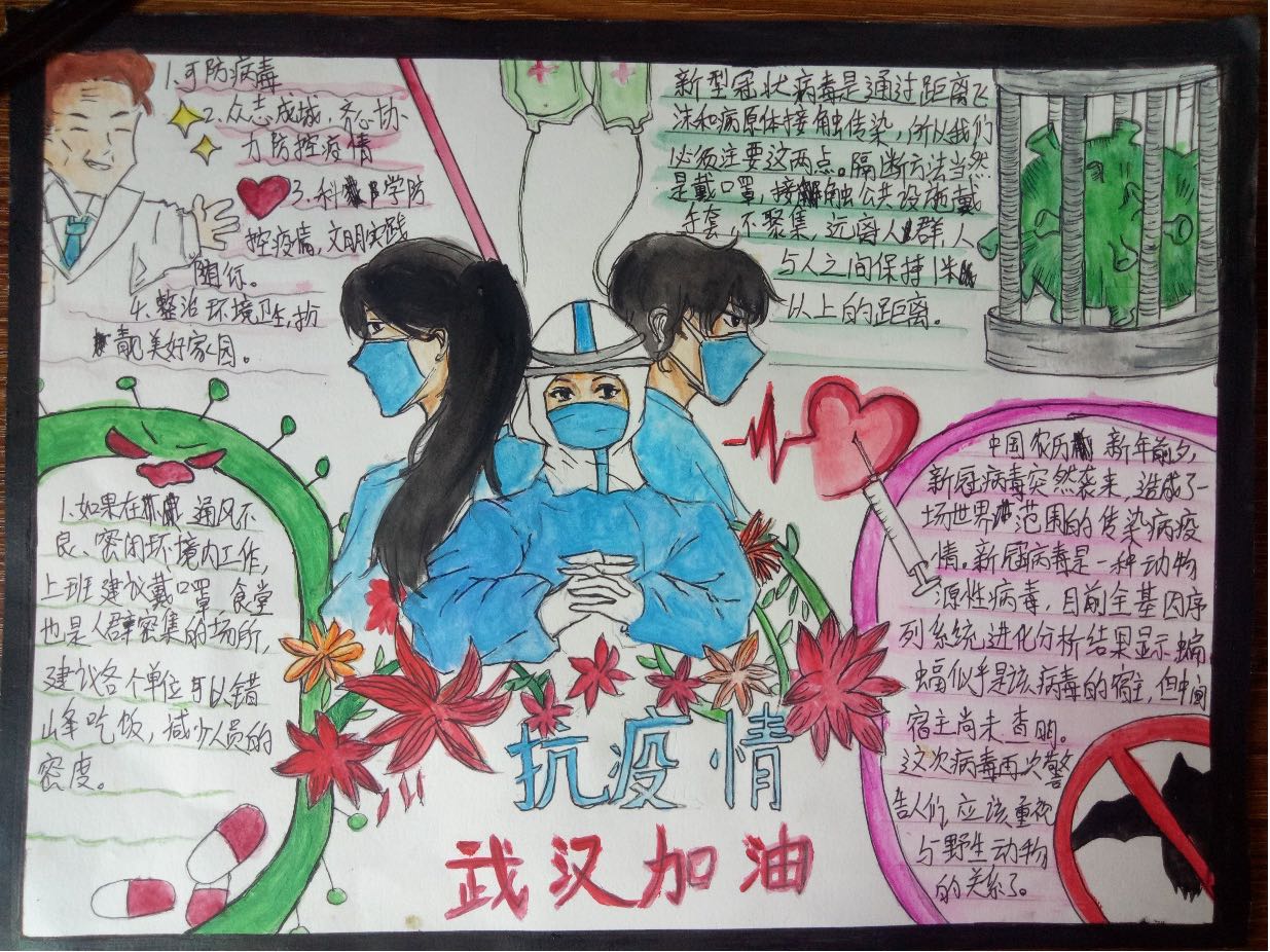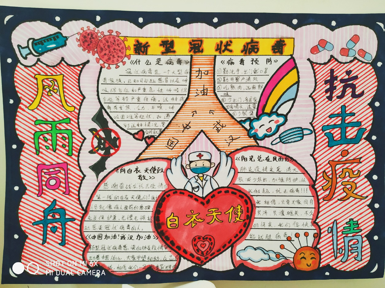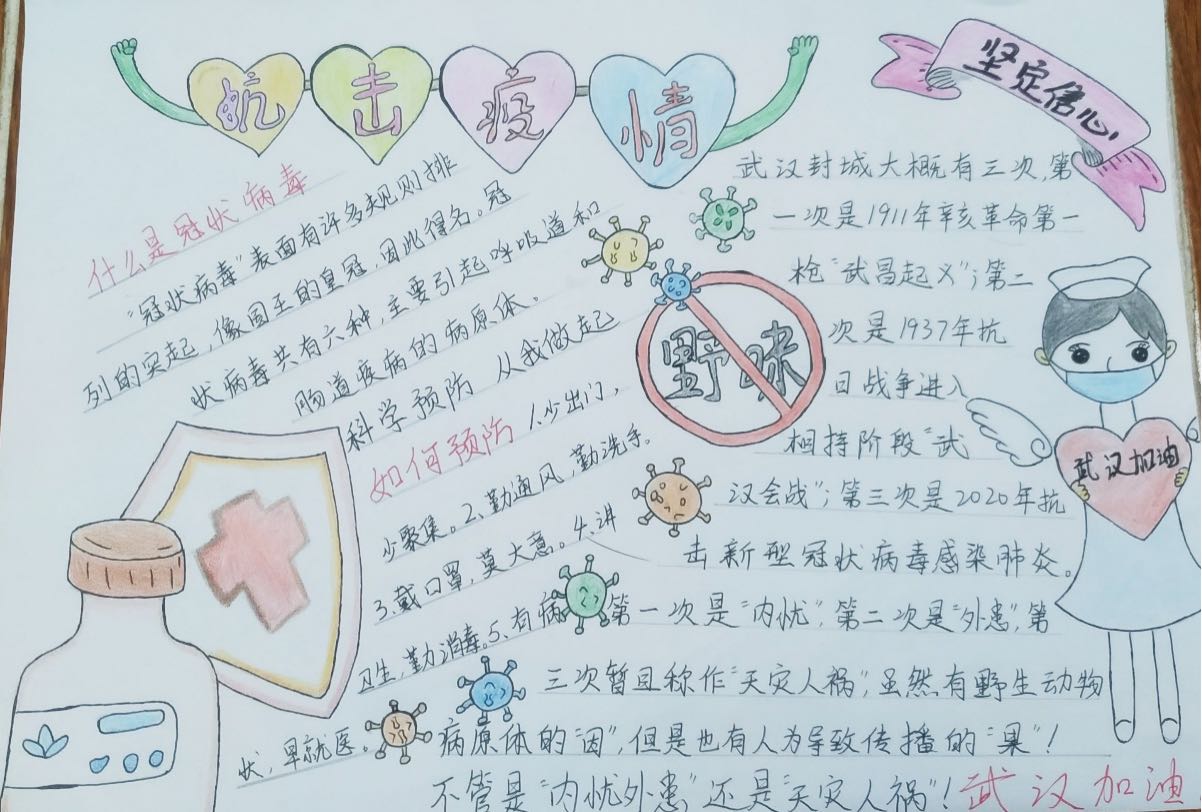 在校党委、学校团委的指导下,为进一步加强我校学生防控疫情责任意识,增强战胜疫情的信心和决心,主校区团总支在2020年3月初,开展了围绕"风雨同舟,抗击疫情"为主题的线上手抄报评比活动。宣传疫情防控的意识,保持积极的抗疫心态,传递正能量,助力疫情,为武汉加油!