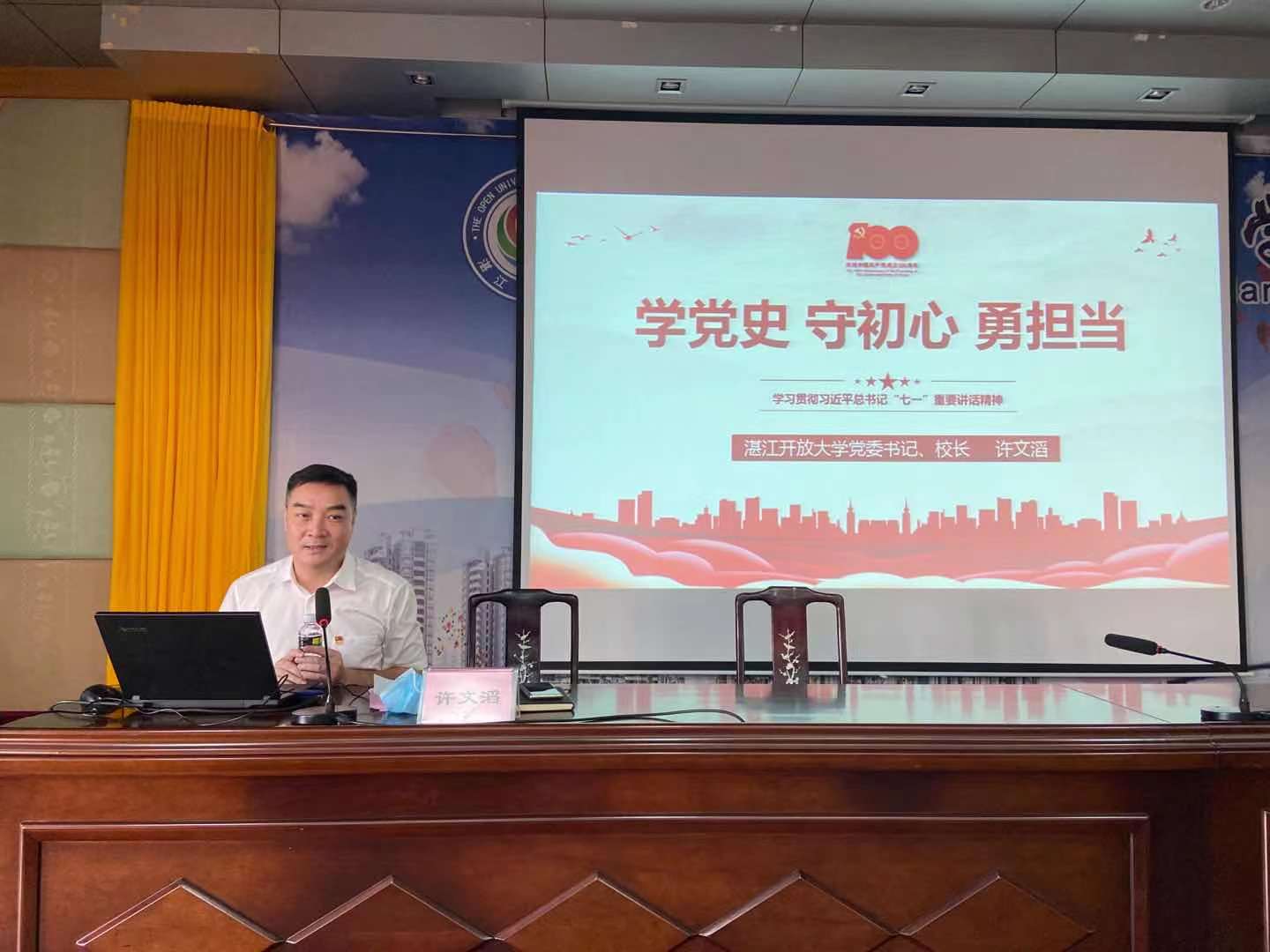 2021年是特别的一年,是建党一百周年。为进一步强化使命担当,坚定理想信念,厚植家国情怀,我校党委书记、校长许文滔同志为新生讲授了开学思政第一课——《学党史 守初心 勇担当 做昂扬向前的开大学子》。许文滔同志传达了习近平总书记"七一"重要讲话精神,讲话围绕"七一"重要讲话的核心要义、重大意义、丰富内涵以及做昂扬向前的开大学子四个部分展开。通过分享优秀校友的事迹,许校长希望同学们深刻领会此次思政课的意义,谨记选择和自律这2个关键词,敢于担当担责,不忘初心,争做昂扬向前的开大学子,以优异成绩迎接建党一百周年。