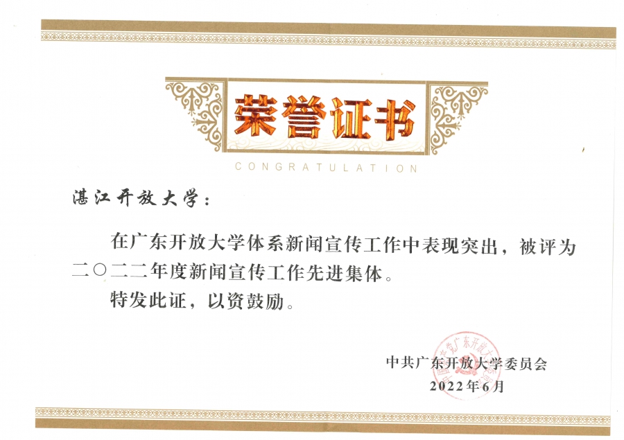 2021年以来,我校深入学习贯彻习近平新时代中国特色社会主义思想,贯彻落实习近平总书记关于宣传思想工作的重要论述,扎实推进新闻宣传工作,根据《关于表彰2022年度新闻宣传工作先进集体和先进个人的决定》(粤开大党〔2022〕29号),我校获得“2022年度新闻宣传工作先进集体”称号,我校陆茜老师获得“2022年度新闻宣传工作先进个人”称号。