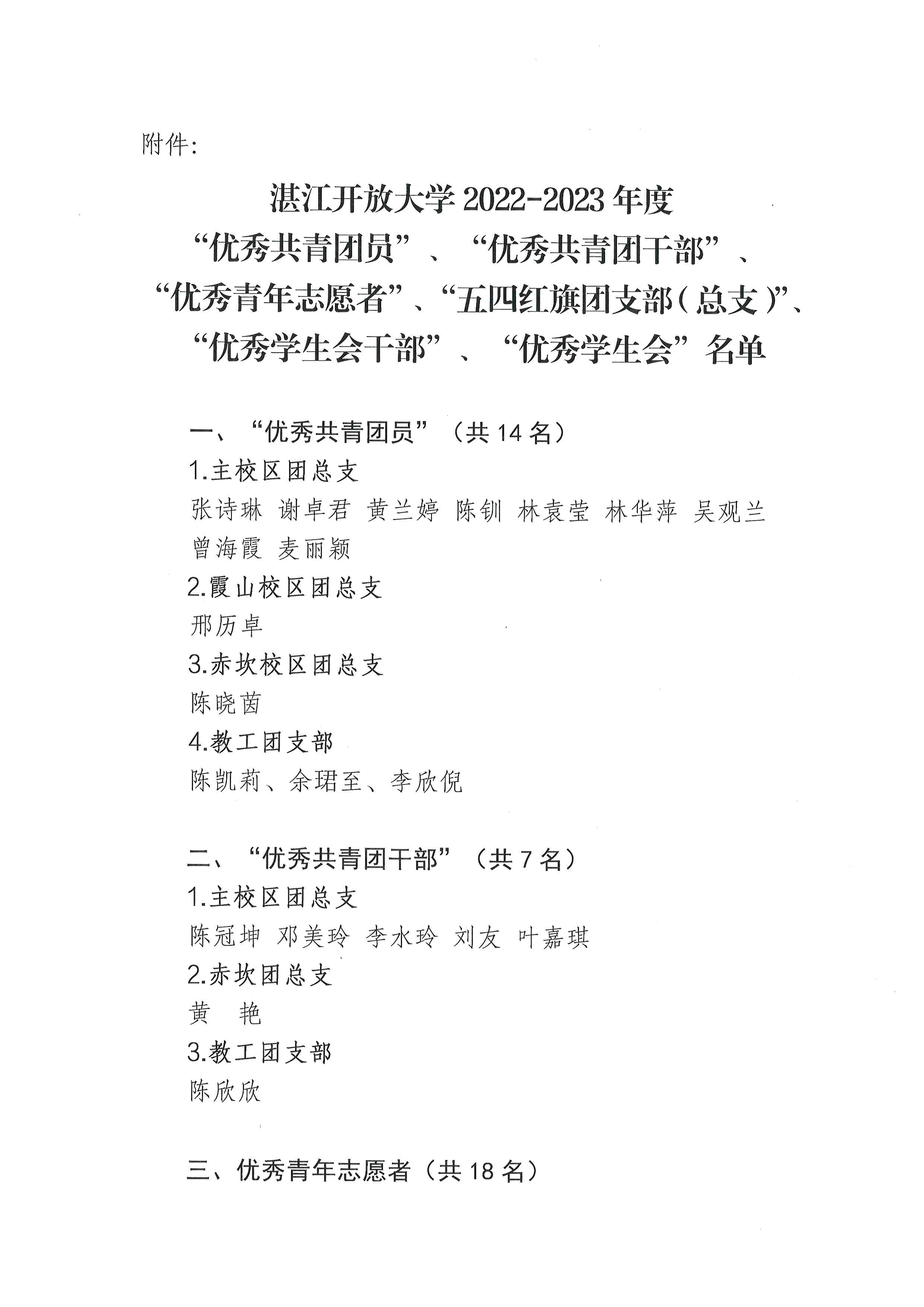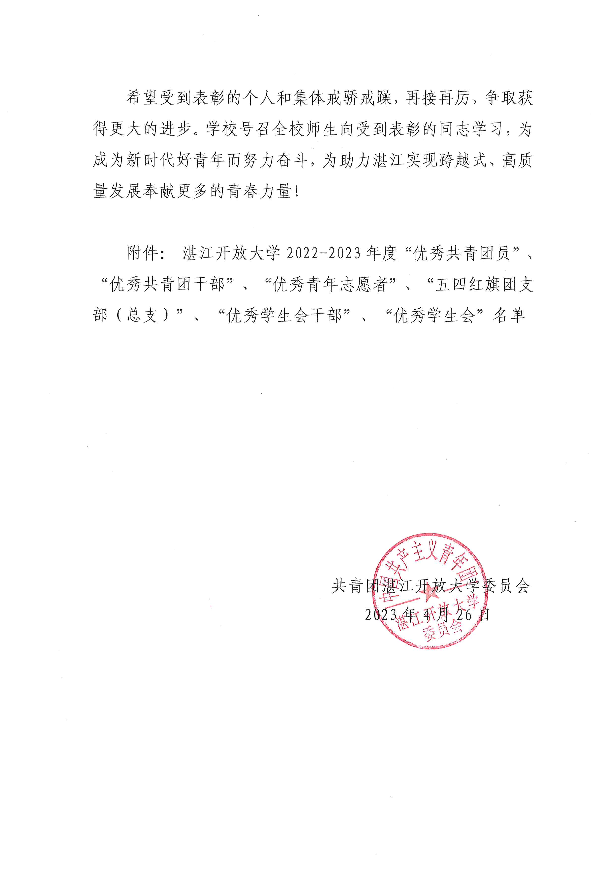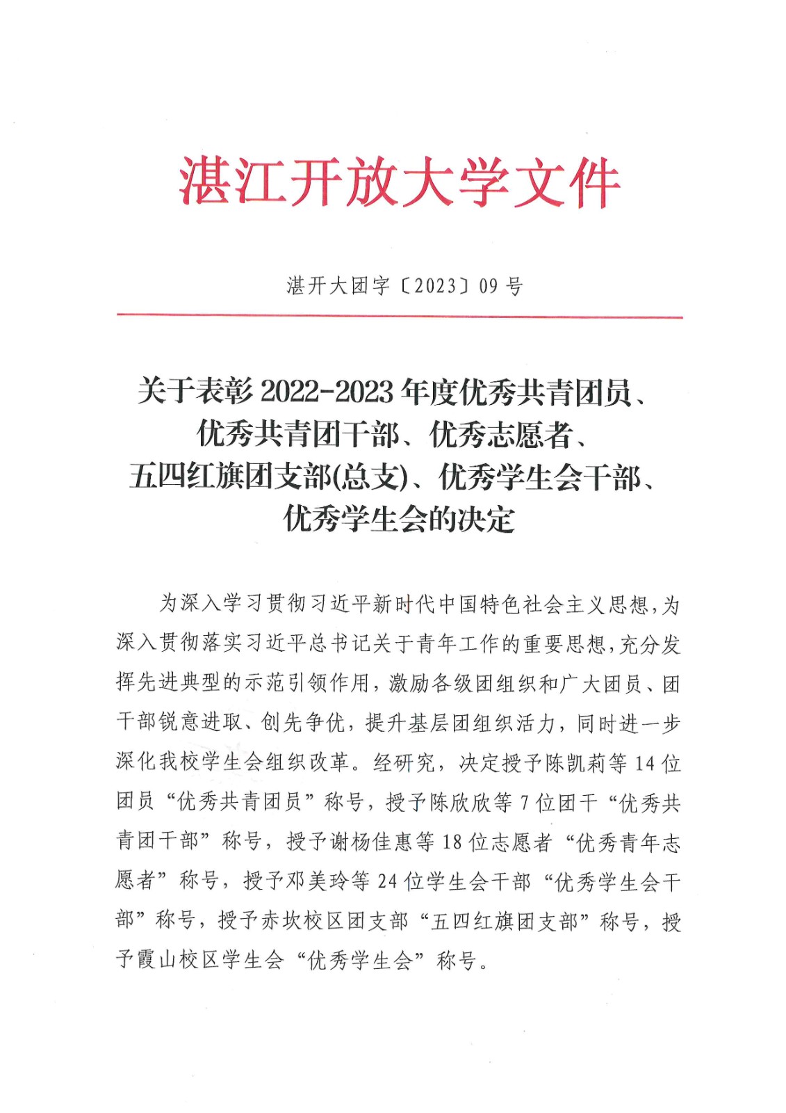 关于表彰2022-2023年度优秀共青团员、优秀共青团干部、优秀志愿者、五四红旗团支部(总支)、优秀学生会干部、优秀学生会的决定