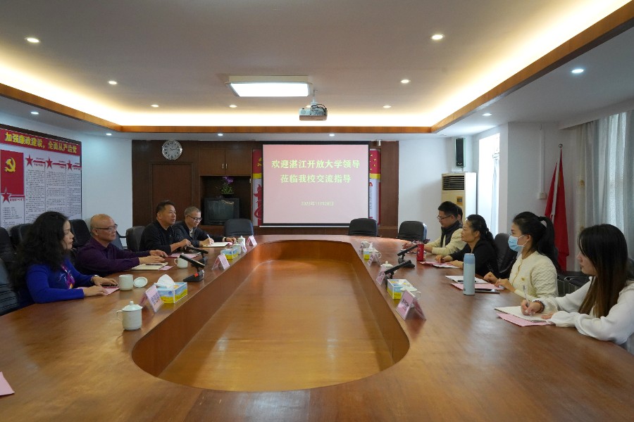 在阳江开放大学,听取了该校的办学情况,就两校教学管理、科研、招生和社区教育等工作进行交流,并针对开放教育和中职教育的教学教务一体化管理的重难点问题深入探讨。