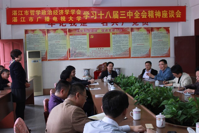 11月22日,湛江市哲学政治经济学学会和湛江市广播电视大学联合在湛江电大召开了学习贯彻中共十八届三中全会精神座谈会,市政协副主席、广东海洋大学副校长、学会名誉会长朱坚真出席会议并致辞,来自湛江开发区、海大、湛师、市委党校的学会专家和湛江电大教师代表40多人参加了这次活动。学会会长廖东主持会议并代表学会作了工作总结,部署了明年的任务,学会副会长、秘书长、湛江电大党委书记、校长李连红组织了座谈和讨论。