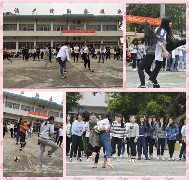 首先,在活动的开幕式上,李连红校长代表学校向全校的女生寄予节日的问候与祝福,希望女生们在活动中赛出水平、赛出风格、赛得开心。接着,是双龙戏珠、毽球和乒乓球等比赛活动,经过激烈的角逐,最后14服装设计与工艺1班、14学前教育班和15学前教育B班分别获得了双龙戏珠团体比赛的前三名袁诗婷、梁春娇、欧丽媚和王可欣同学分别获得了毽球个人比赛的前四名陆晓婷、罗晓君、雷晨晓和黎水滢同学分别获得了乒乓球个人比赛的前四名。