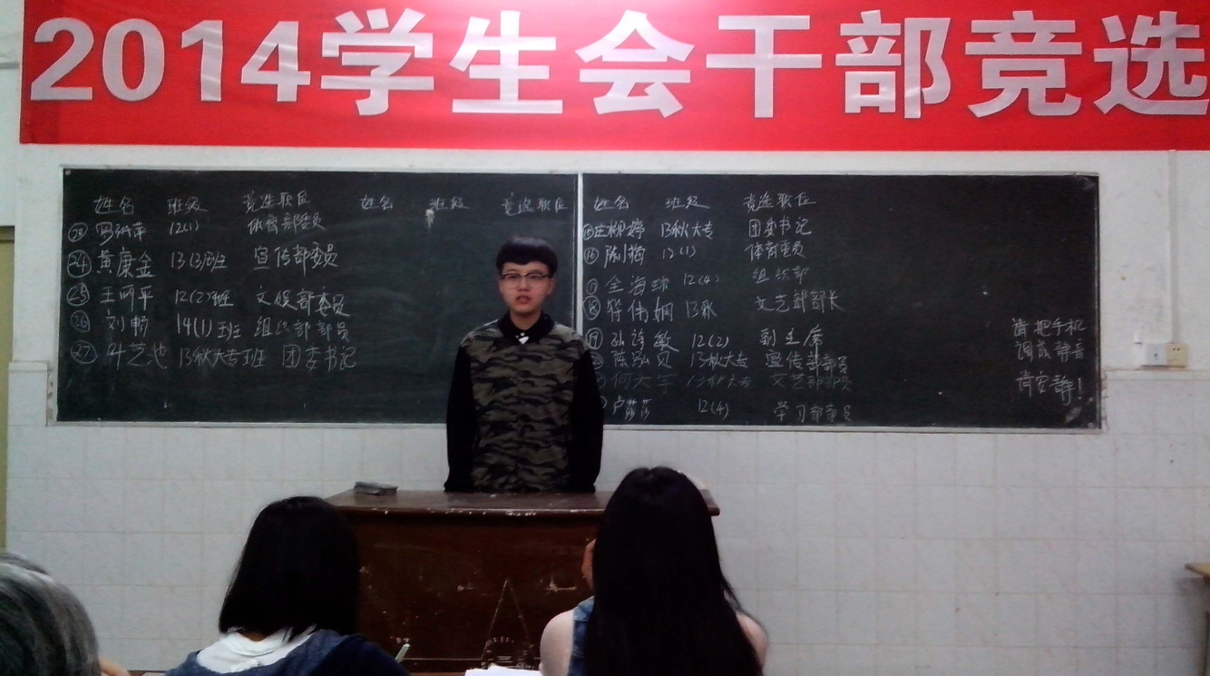 2014年3月18日晚,我校主校区召开了学生会干部竞选大会,66名选手参加了本次竞选。整个竞选过程严格按照预定的议程进行,气氛非常活跃。学校领导林锦主任、李灿坤副主任、肖艳老师以及现任学生会、团支部副部级以上干部均出席了本次竞选大会,评审小组依据公平、公正、公开的原则择优选聘。