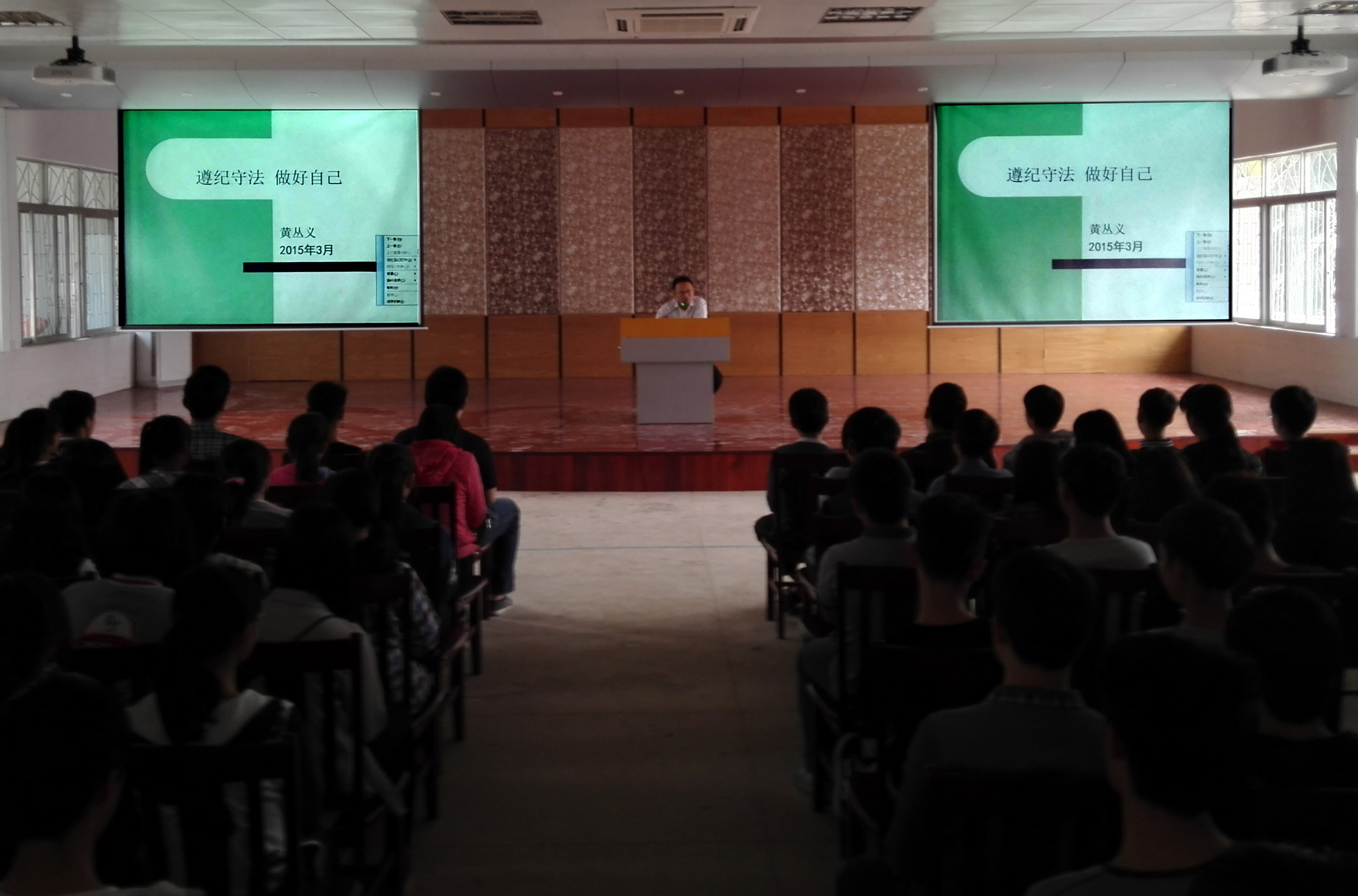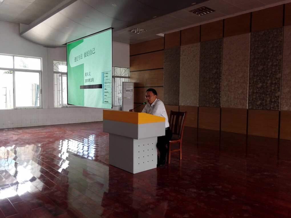 为了进一步推进依法治校,丰富主校区学生的文体活动,增强同学们的法律意识和提高同学们的法律素质,2015年3月24日下午3时,主校区在礼堂举办了主题为"遵纪守法,做好自己"的法律知识讲座。本次讲座由湛江市财政职业技术学校副校长黄丛义主讲。黄丛义副校长首先从案例"庞某某抢劫案"切入主题,说明违法犯罪严重性,其终究要受到法律的惩罚接着黄副校长进一步分析了青少年违法犯罪的原因,即他们法律知识和法律意识不强、交友不慎、不遵守学校的规章制度等最后为了让同学们能够遵纪守法,做好自己,黄副校长给出了三条重要的建议,即学会生活、学会读书和学会读人。