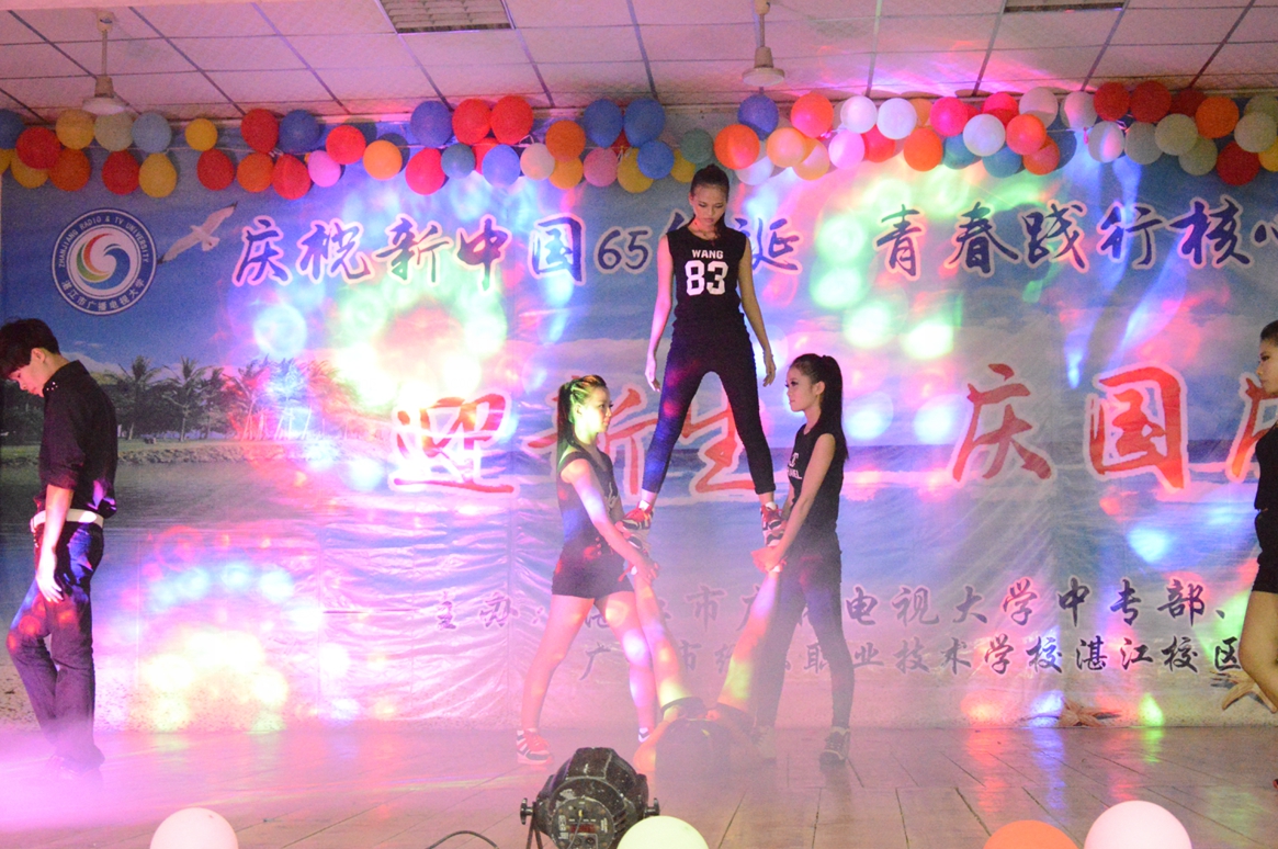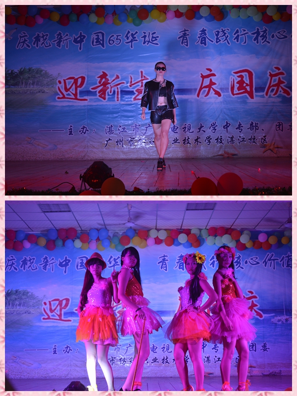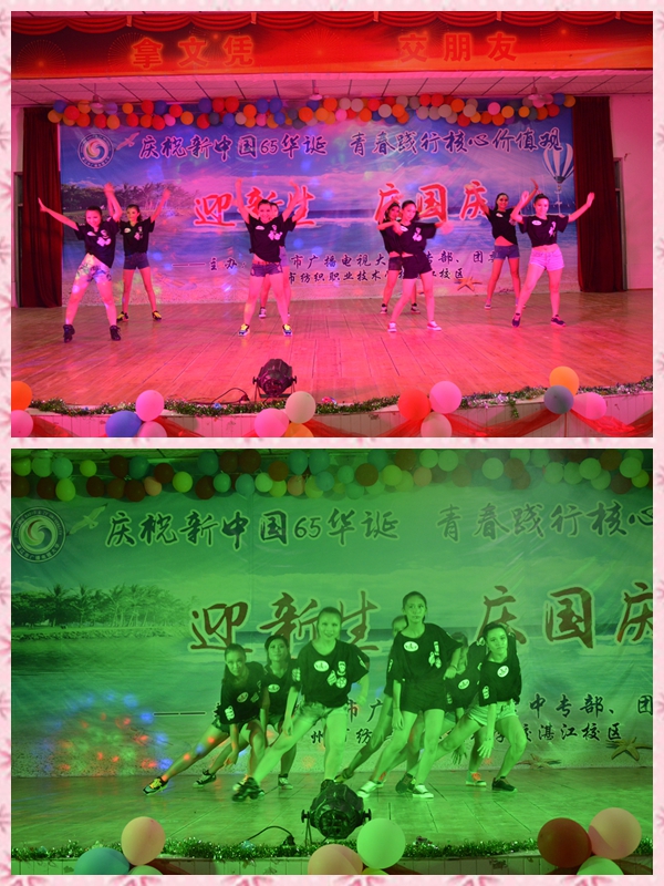 为欢迎2014级新生,庆祝伟大祖国65周年华诞。由中专部和团委举办的"迎新生,庆国庆"文艺晚会于9月29日晚在中专部礼堂隆重举行。