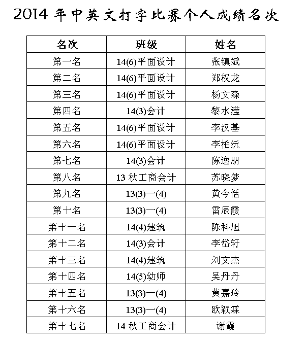 为了弘扬湛江电大主校区校园文化,丰富同学们的业余生活,于2014年12月8日星期一下午4点30分举行了本次打字比赛,比赛分为中文打字和英文打字软件选用《金山打字通》每个班级选取5名代表参加比赛,成绩取每分钟中文打字字数和英文打字字数的总和。