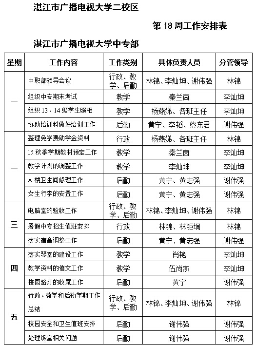 主校区和中专部第18周工作安排表