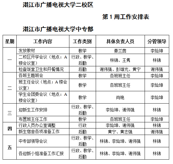主校区和中专部第1周工作安排