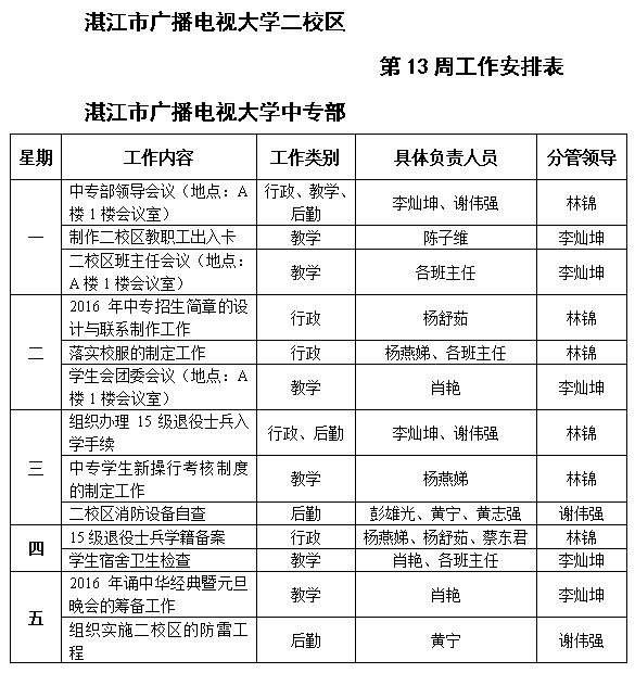 主校区和中专部第13周工作安排