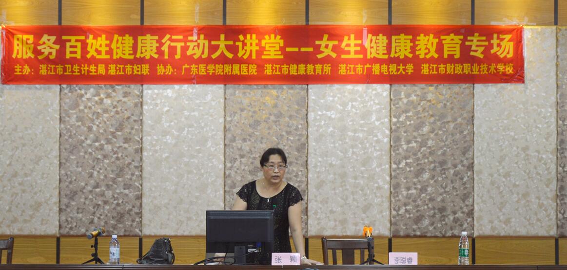 当今社会上女生遇害事件越发频繁,很多女生涉世未深,缺乏自我保护意识,因此遇到危险惊慌失措,不能很好地保护自己。同时处于青春期的女生,性生理发育还没有完成成熟,而且由于传统性观念的影响,她们对性知识还不是很了解。为了使主校区女生身心得到更好的发展,更好地保护自己,2015年9月22日下午4:30,由湛江市卫生计生局和湛江市妇联主办,广东医学院附属医院、湛江市健康教育所、湛江市广播电视大学和湛江市财政职业技术学校协办的"服务百姓健康行动大讲堂--女生健康教育专场"讲座如期在主校区举行。