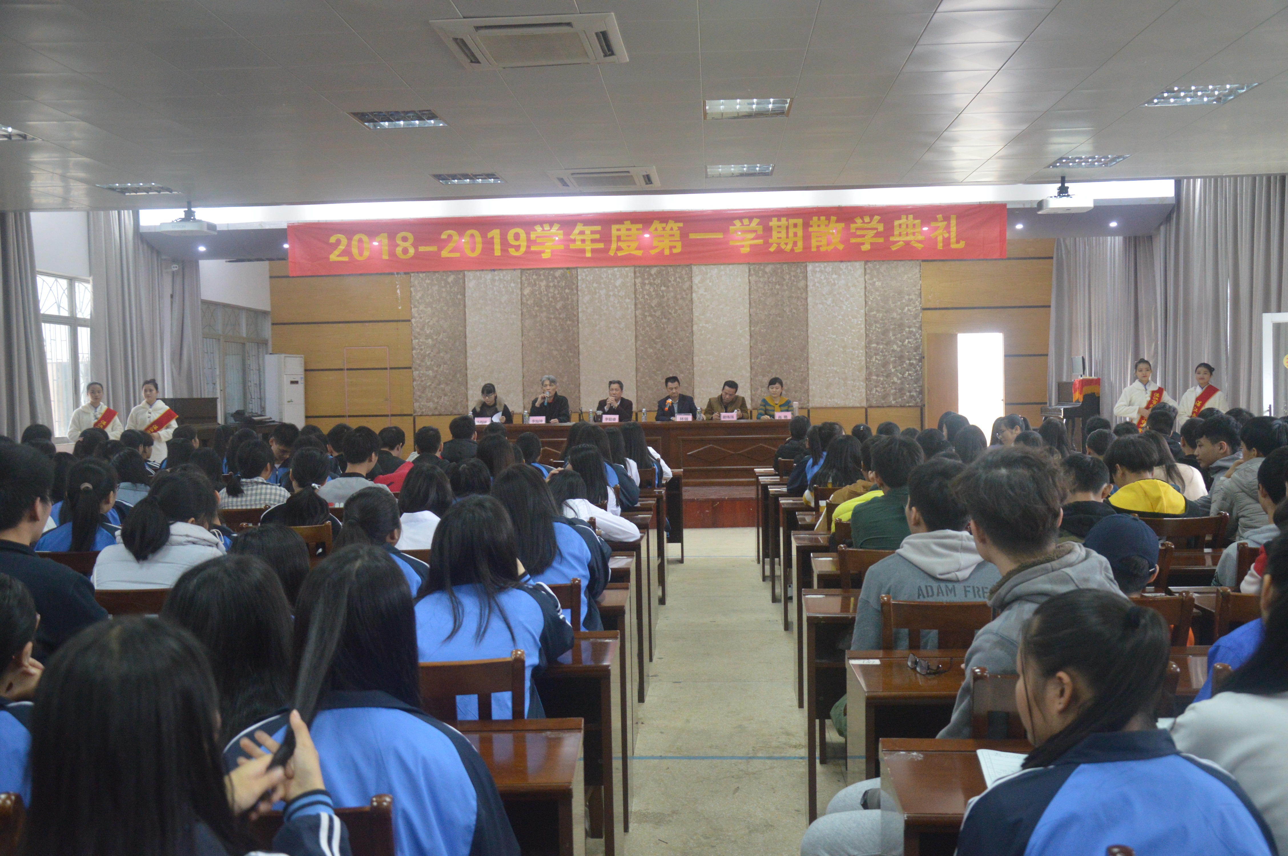 2019年1月11日上午,我校主校区全体师生齐聚礼堂,隆重召开2018-2019学年第一学期表彰先进暨散学典礼会议。