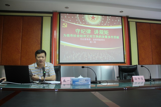 【廉江电大办公室报道】为更好地开展纪律教育学习月活动,近日,廉江电大邀请市纪委常委、监察局副局长戚一高同志以《守纪律、讲规矩,为我市社会经济又好又快的发展多作贡献》为题,举办纪律教育学习报告会。戚一高常委重点围绕"准确理解把握党内'规矩'的内涵",新形势下强调"守纪律、讲规矩的重要意义","当前基层干部不守纪律,不讲规矩的表现","遵规守纪,做廉洁自律的好干部"等四个方面进行全面阐述。报告主题鲜明,既有理论分析,又有案例剖析。戚一高常委认为,做践行守纪律讲规矩的模范,一要增强"两个意识"(增强主体责任意识,增强为人民服务意识)二要克服"三种心理"(懈怠心理、侥幸心理、特权心理)三要做到"三个严"(严于自律、严守禁令、严格依规依法办事)。在报告会上,涂华伟校长根据戚常委的报告,结合学校存在问题,对教职工 "守纪律、讲规矩"谈了四点意见,希望通过戚常委的辅导报告,今年纪律教育学习月活动,与时俱进,提高认识,为学校更好更快发展作出积极贡献。