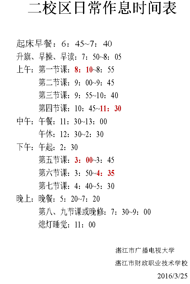 您现在的位置是:首页>财政中专 > 学习园地 > 校规校纪 校规校纪 主校区日常作息时间表 发布人: 日期:2018-04-13 00:00浏览次数:14440点赞次数:6 湛江开大,湛江开放大学,湛江市财政职业技术学校,湛江市广播电视大学,湛江电大,中专教育,中职教育,成人教育,成人大专,成人本科,官网,教育部电子注册,国际学历绿卡。湛江开放大学(湛江市广播电视大学)办学三十年来... 很赞哦!6 上一篇 主校区校门管理规定 下一篇 关于宿舍管理的补充规定 关于宿舍管理的补充规定 为了加强宿舍管理,营造一个整洁舒适的生活环境,在原宿舍管理规定的基础上,现制定若干补充规定,具体内容如下:每天早上8:00、下午3:00前,必须整理好寝室内务,要求叠放好被褥、枕头,挂布要收拢,蚊帐要收起、挂起或靠墙放置。不得在寝室、厅房挂放衣(鞋)物、毛巾和堆放杂物,不得将厅房的储物柜、桌子、凳子搬到别处。未经允许储物柜上不得摆放物品,临时挪用凳子的,用完后要放回原处。除 相关文章 湛江市财政职业技术学校学生管理实施细则 关于宿舍管理的补充规定 主校区日常作息时间表 主校区校门管理规定 课堂教学规程 食堂开放时间