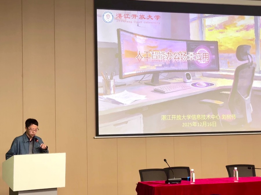 随后,湛江开放大学信息技术中心主任刘树伟以《人工智能在办公场景中的应用》为题,梳理了2023—2025年间人工智能技术的突破进展,重点介绍了生成式AI、大语言模型及多模态AI等在教育、办公中的实际应用。通过教学案例分析,他展示了AI在课程设计、课件制作、作业批改与成绩分析等方面的辅助作用,并指出“人工智能是工具,人始终是主导”,倡导合理、有判断地运用AI技术。