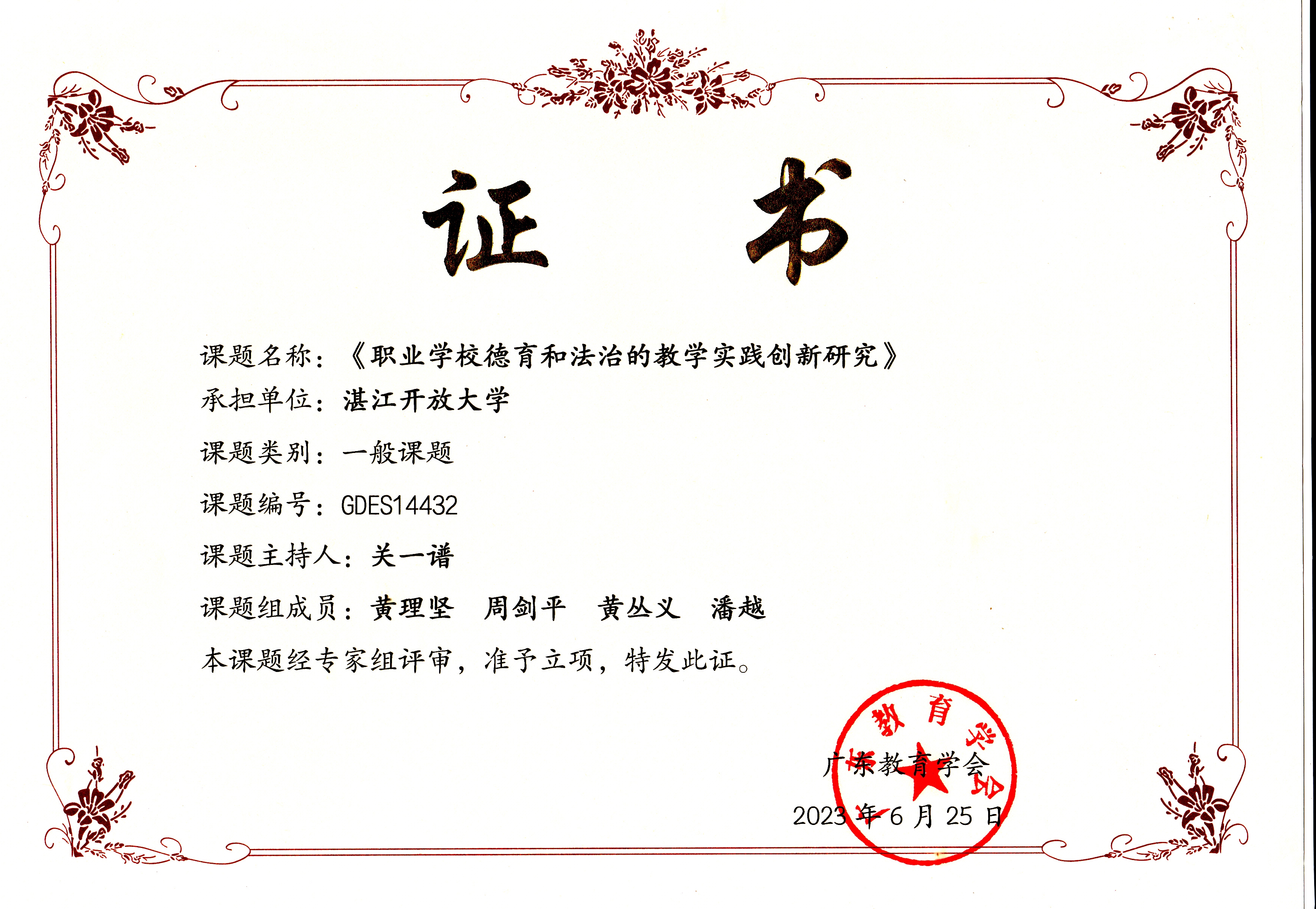 广东教育学会于 2023 年 6 月 25 日为该课题颁发立项证书,期待该课题能为职业教育领域的普法理论研究与教学实践带来新突破。